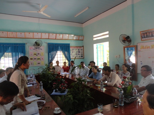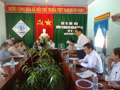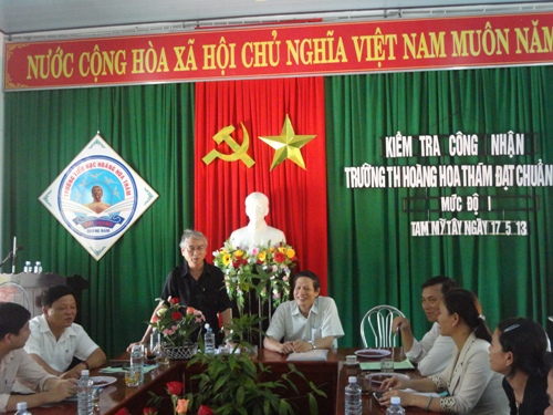 Cô Võ Thị Liên báo cáo tóm tắt quá trình và kết quả xây dựng trường TH Hoàng Hoa Thám đạt chuẩn Quốc gia mức I. Đoàn tiến hành kiểm tra HS 5 tiêu chuẩn, kiểm tra thực tế cơ sở vật chất, chất lượng dạy và học. Qua kiểm tra thẩm định đoàn đã đánh giá rất cao về tinh thần xây dựng trường chuẩn của tập thể HĐSP nhà trường, đặc biệt là có một tập thể đoàn kết, nhiệt tình. Ông Nguyễn Tấn Từ thay mặt đoàn đánh giá từng tiêu chuẩnvà kết luận cả 5 tiêu chuẩn đều đạt và mong muốn tất cả các thầy cô giáo hãy phấn đấu hơn nữa trong công tác dạy và học để nâng cao chất lượng thực chất, chất lượng các phong trào mũi nhọn.Đoàn sẽ đề nghị UBND tỉnh ra quyết định công nhận trường TH hoàng Hoa Thám đạt chuẩn QG mức I năm 2013.